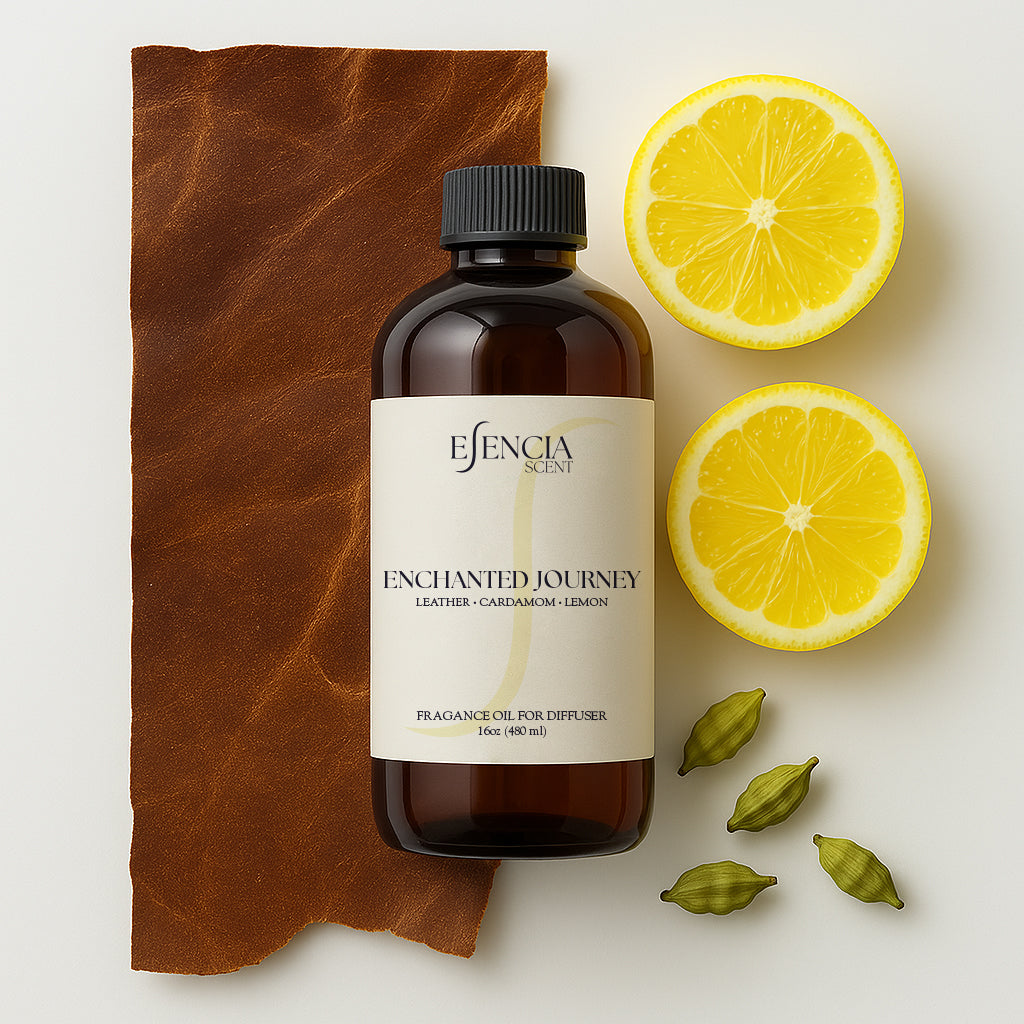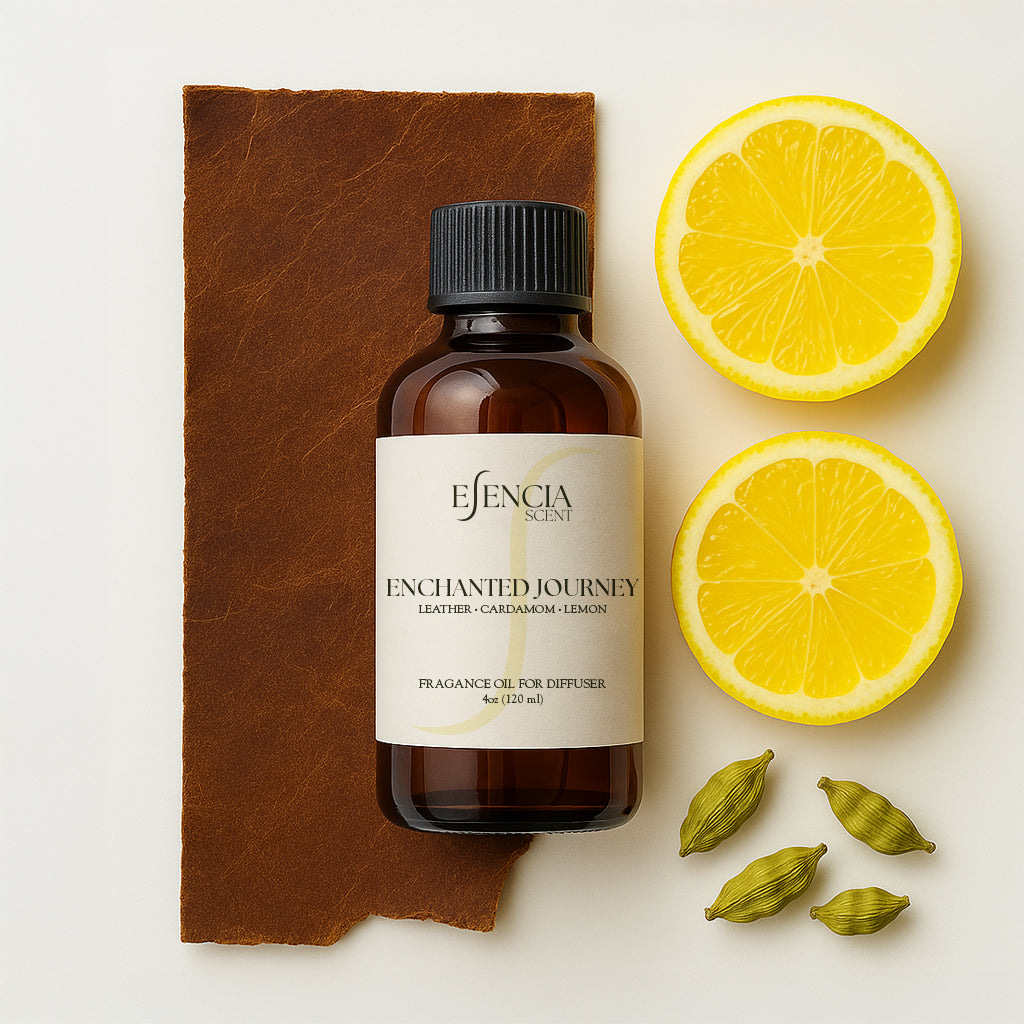 Enchanted Journey of Esencia Scents is a warm, rich blend that feels like a quiet night in. With the cozy smell of leather, a touch of spice from cardamom, and a light hint of lemon, it’s a great way to freshen up any space without being too strong.